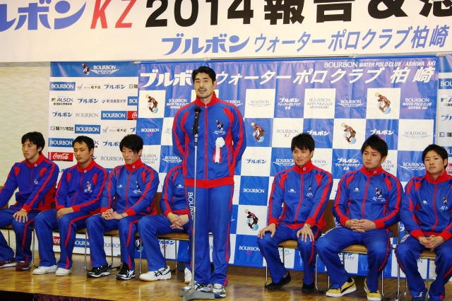 報告会で来年度に向け、新たな決意を語る青柳監督兼選手=25日、産文会館 (2014/11/26)