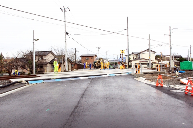 旧佐藤医院側から見た拡幅後の「山本踏切」。右方向に西中通駅。右側に歩道が設置される (2014/11/28)