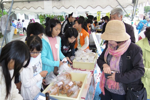 刈羽産豆腐の販売コーナーで元気のいい声を上げる小学生 (2014/11/10)