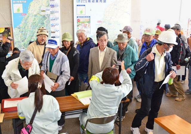 避難経由所に見立てた施設に到着し、市職員から確認を受ける市内高浜地区の人たち=11日午前11時ごろ、長岡市島崎の道の駅「良寛の里わしま」 (2014/11/11)