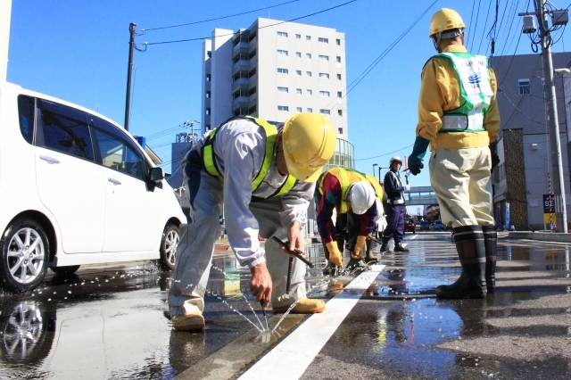 消雪パイプのノズルから均一に水が出るように調整する委託業者=市内西本町1の国道352号 (2014/11/12)