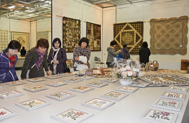 キルトの力作が並んだフラワーバスケットの会作品展=13日、ソフィアセンター (2014/11/13)