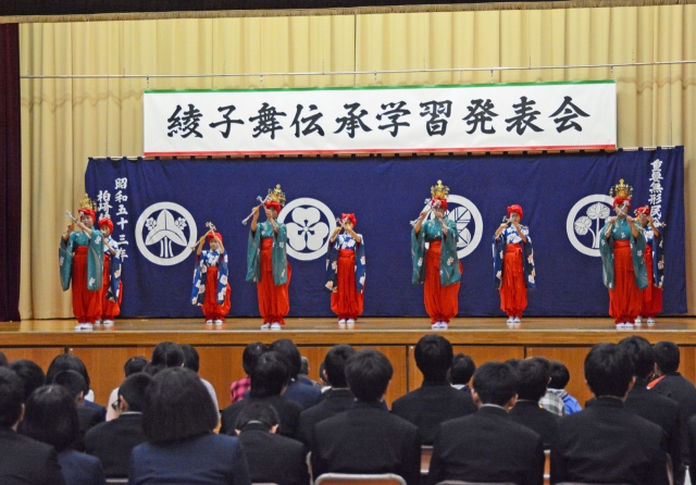 伝承学習の成果を披露した綾子舞の発表会=14日、南中 (2014/11/15)
