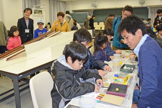 親子連れら1500人が来場した「科学の祭典」のブース=15日、新潟工科大 (2014/11/17)