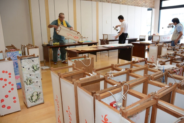絵あんどん展に向け、市内外から寄せられた作品をあんどんに仕立てる作業 (2014/07/31)