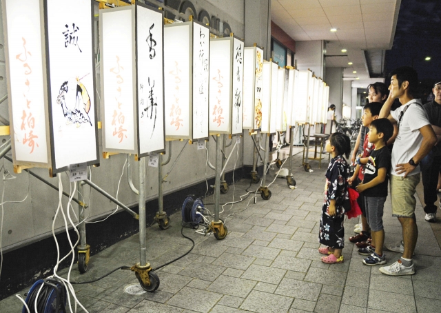 ずらりと並ぶ絵あんどん作品に見入る家族連れら=2日午後7時半ごろ、市内東本町1 (2014/08/04)