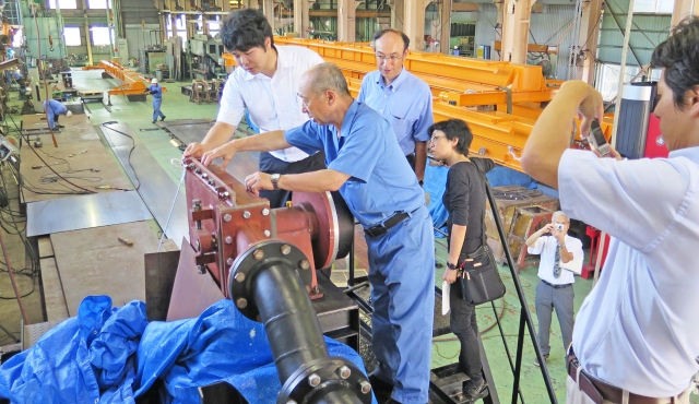 クロスフロー水車を高校教諭に説明する綱島社長(中央)=中越工業 (2014/08/05)