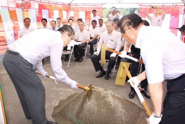 J3DDの新工場建設に向け、くわ入れをする斎藤社長(右)=6日、田尻工業団地 (2014/08/07)