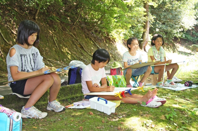 小・中学生夏休み写生大会で絵筆を走らせる参加者=7日午前、赤坂山公園 (2014/08/08)