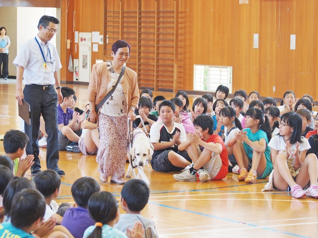 盲導犬ウランとともに剣野小を訪れた郡司ななえさん (2014/06/28)