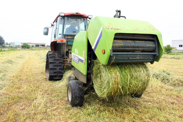 刈った牧草を専用の機械で円筒形に。この後、ラップをかけ、乳酸発酵させる (2014/06/18)