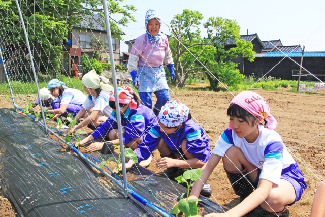 農家の人を先生に、刈羽節成きゅうりの苗を植える槙原小6年生。「元気に育って」と願いを込めた (2014/05/14)