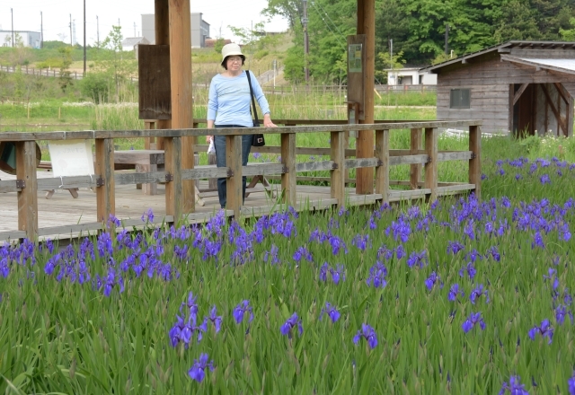 池を彩るカキツバタの紫色の花。今週末から来週にかけて見頃になりそうだ=14日、夢の森公園  (2014/05/16)
