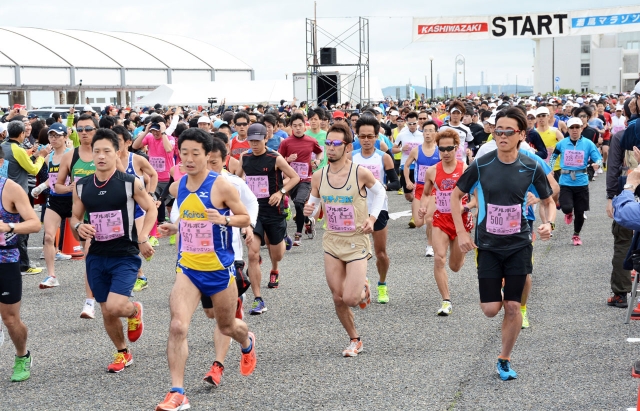 潮風マラソン・フルの部で一斉にスタートするランナー=みなとまち海浜公園 (2014/05/19)
