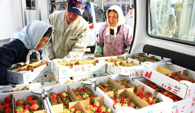 市場に出荷するため、朝摘みイチゴを積み込む下大新田の人たち=20日朝 (2014/05/20)