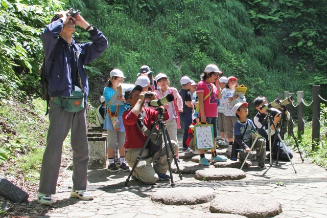 新緑の中で行われた鯖石小の探鳥会=19日、市内善根の不動滝周辺 (2014/05/22)