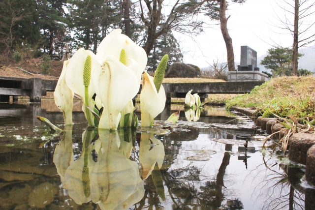 綾子舞会館前の人工池で見頃のミズバショウ (2014/04/19)