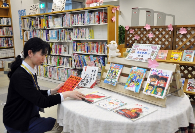 今月の児童コーナーに設けられた「1年生におすすめの本」=ソフィアセンター (2014/04/25)