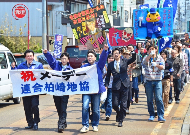連合柏崎地協のメーデーで市街をデモ行進する参加者=市内東本町2 (2014/04/26)