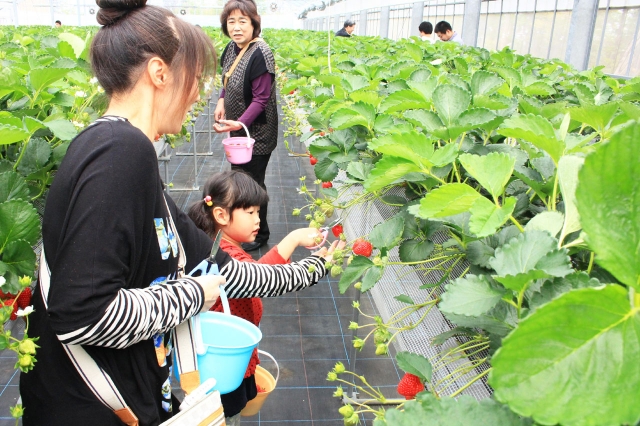 甘い香りがいっぱいのハウスでイチゴ狩りを楽しむ家族連れ=29日 (2014/04/30)