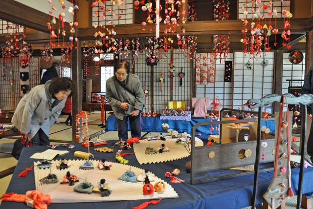 和の手仕事の楽しさを伝える「つるし雛飾り」展。訪れた人たちがじっくり見入っている=6日、市内新道の飯塚邸 (2014/04/08)