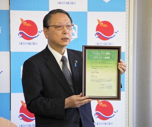 J―クレジットの登録証を手にする会田市長=9日、市役所大会議室 (2014/04/09)