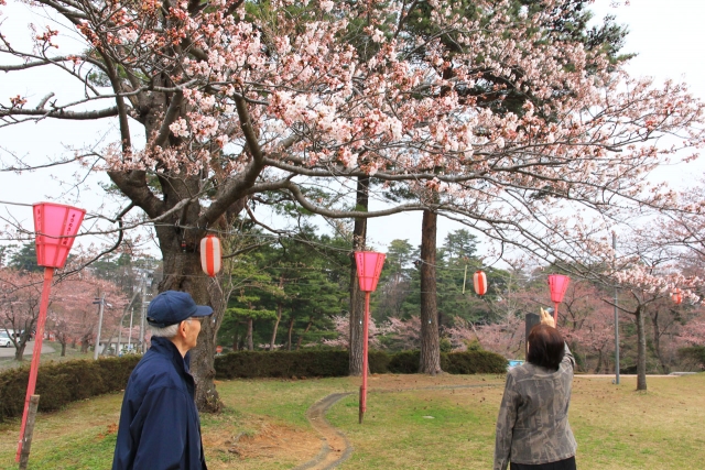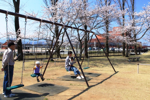 ようやく桜の花の見頃を迎えた駅前公園。少し風は冷たいが、園内で遊ぶ人たちの姿が見られた=15日 (2014/04/15)