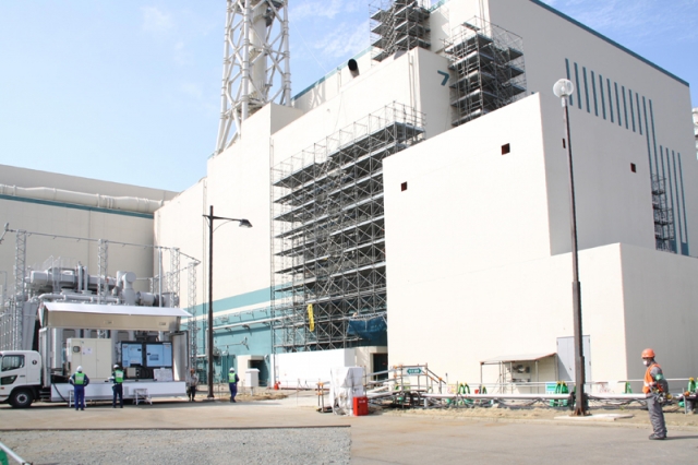 柏崎刈羽原発7号機のフィルター付きベント設備(右手前)。車載の窒素発生装置(左)を使った通気試験=10日 (2014/04/11)