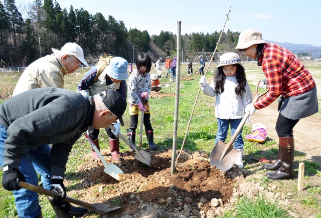 桜の苗木を植える植物友の会の会員、一般市民ら=12日、夢の森公園 (2014/04/14)