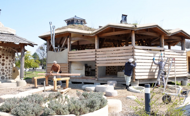 園内の間伐材を利用し、在来工法で建築が進められた「ピザ窯付きキッチンスペース」=12日、夢の森公園 (2014/04/17)