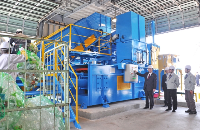 資源物圧縮減容機のスイッチを押す会田市長=28日、市内松波4、クリーンセンターかしわざき  (2014/03/29)
