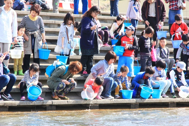 4年後の回帰を願ってサケの稚魚を放流する人たち=29日、市内青海川のふるさと公園 (2014/03/31)