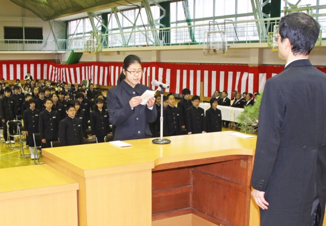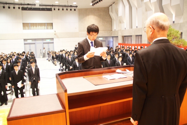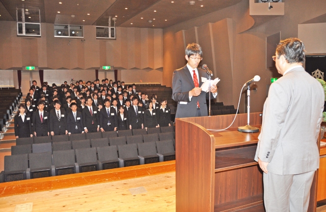 新潟工科大の入学式で誓いの言葉を述べる学部入学生=3日、同大講堂 (2014/04/03)