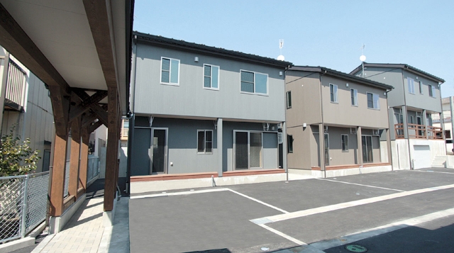 えんま通り商店街で完成した分譲住宅。左は共用のがん木が特徴だ (2014/04/02)
