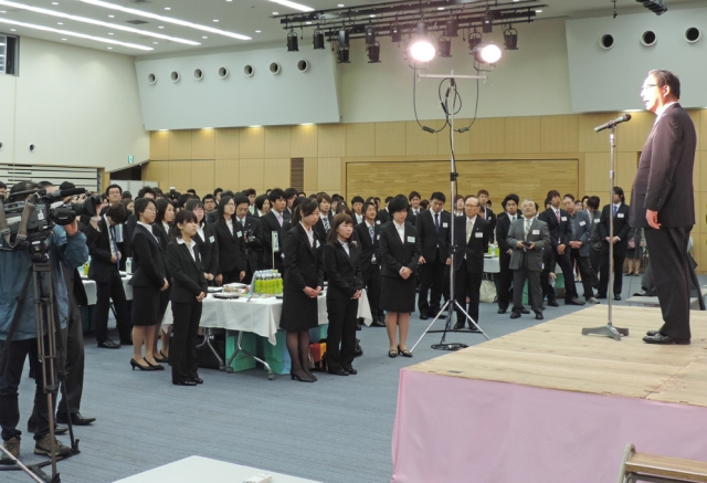 ブルボン入社式で吉田社長(手前)に決意を述べる新入社員=1日、産文会館 (2014/04/01)