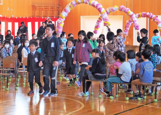 6年生に手を引かれて入場する新1年生=7日午前、荒浜小 (2014/04/07)