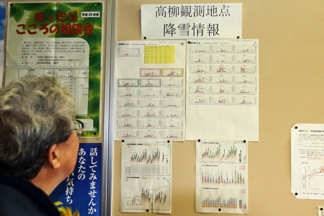高柳町事務所内のバス待合室に掲示された39年分の降雪・積雪記録 (2014/01/30)