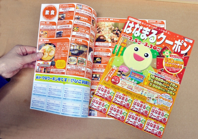 はなまるクーポン券8枚が付いたチラシ。148店が参加してスタートする (2014/01/31)