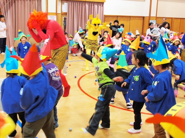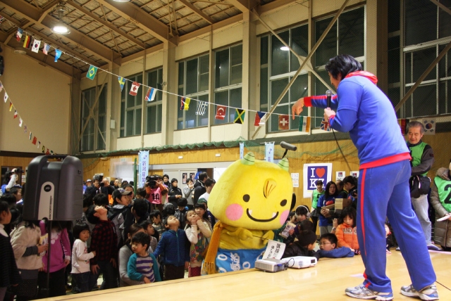 地元住民ら500人が参加した冬の大運動会。「曽地(そっち)向いてホイ」に子どもたちが歓声を上げ、楽しんだ=7日、中通コミセン (2014/02/08)