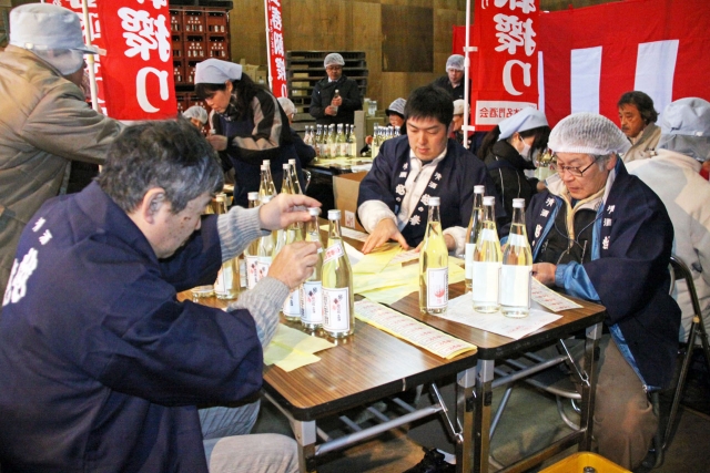 立春の酒の出荷で、新酒の瓶にラベルを貼って箱詰め作業をする酒店店主ら=原酒造 (2014/02/04)
