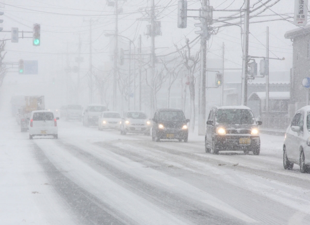 激しい吹雪のため視界が悪く、ライトをつけて走行する車=5日午前10時半前、白竜公園付近 (2014/02/05)