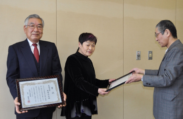 籠島館長から最優秀賞の表彰を受ける藤沢さん(中央)と飯塚さん=5日、市立博物館 (2014/02/07)