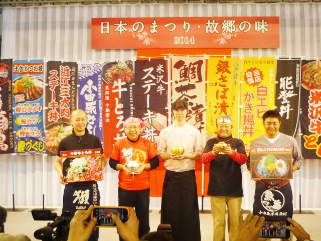 今年のどんぶり選手権の表彰式。準グランプリを獲得した佐藤秀則・鯛プロジェクト部会長(左から2人目)=19日、東京ドーム (2014/01/20)