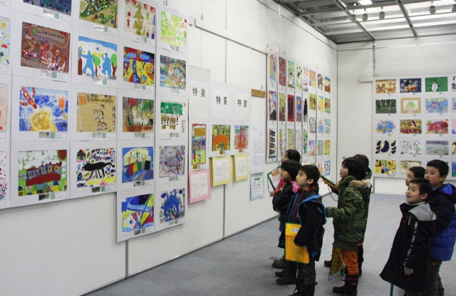 県ジュニア美術展柏崎展で作品を鑑賞する新道小3年生=21日午前、ソフィアセンター (2014/01/21)