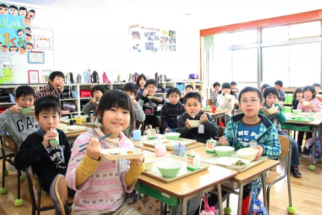 「給食調理コンクール」で最優秀賞に輝いた献立を楽しむ2年生たち。笑顔で箸を進めた=20日、枇杷島小  (2014/01/23)