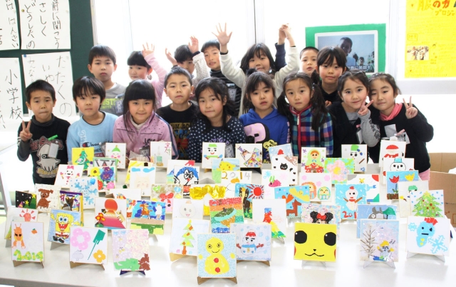 ミニ色紙を貼り絵などで飾った個性あふれる作品と1年生=北鯖石小 (2014/01/25)