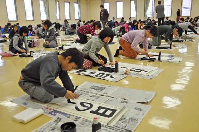 墨の香の漂う会場で、真剣に課題に向き合う柏崎刈羽の小・中学生たち=26日、産文会館大ホール (2014/01/27)