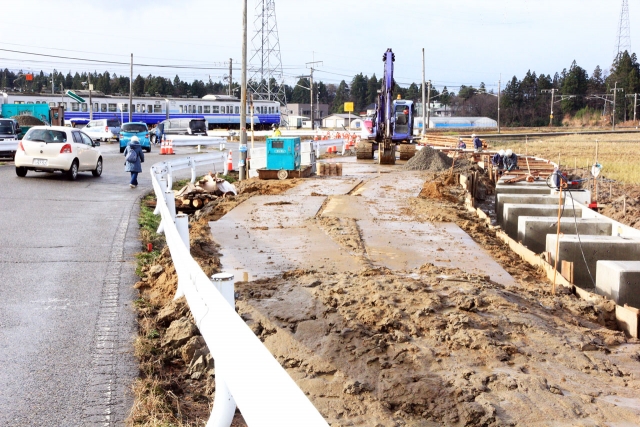 JR信越線「田尻踏切」前のS字緩和を含む拡幅改良工事が進められる市道9―67号線 (2013/12/25)