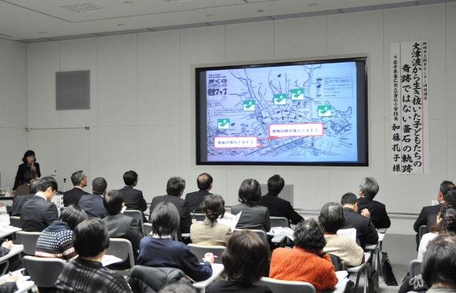 日頃の防災教育の大切さを語る加藤孔子・前釜石小校長=25日、ソフィアセンター (2013/12/26)