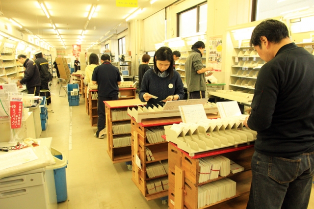 元日の年賀状配達に向け、区分け作業が進められている柏崎郵便局=27日午後 (2013/12/28)